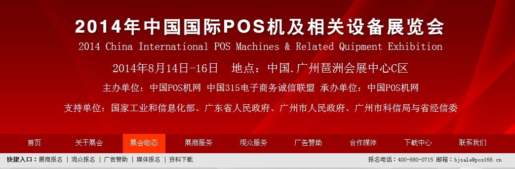 温馨提示:2014年中国(广州)国际POS机及相关设备展览会报名可进入展览会官网(http://www.poszhan.com/),在首页点击“展商报名”或咨询免费热线:400-880-0715