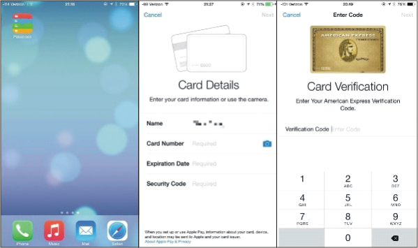 Step1:拿出您的信用卡,打开iphone6手机上的 Passbook 应用,输入信用卡信息(可点击相机图标拍摄信用卡输入),接着再手动输入卡片背面的三位数安全代码作为验证,Apply Pay 的设置就完成了。卡片添加后还能立刻看到最近的刷卡交易记录。