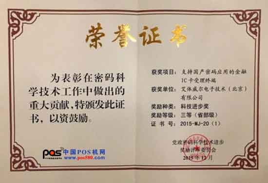 2016年1月26日,艾体威尔电子技术(北京)有限公司(以下简称艾体威尔)荣获由国家密码管理局党政密码科学技术进步奖励评审委员会颁发的“支持国产密码应用的金融IC卡受理终端”项目 “科技进步奖三等奖(省部级)”奖项。
