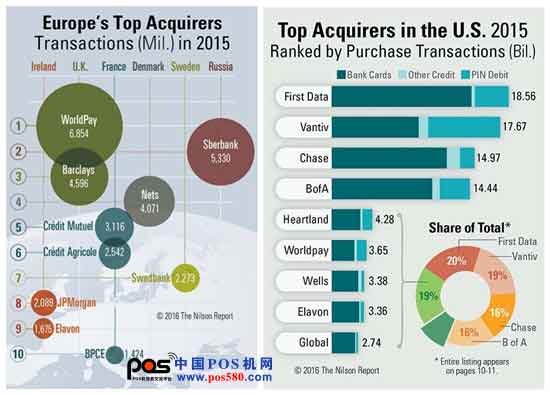 最近尼尔森发布的数据,2015年欧洲和美国交易量的收单行分别是WorldPay和First Data。