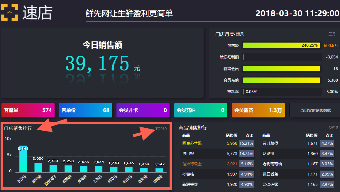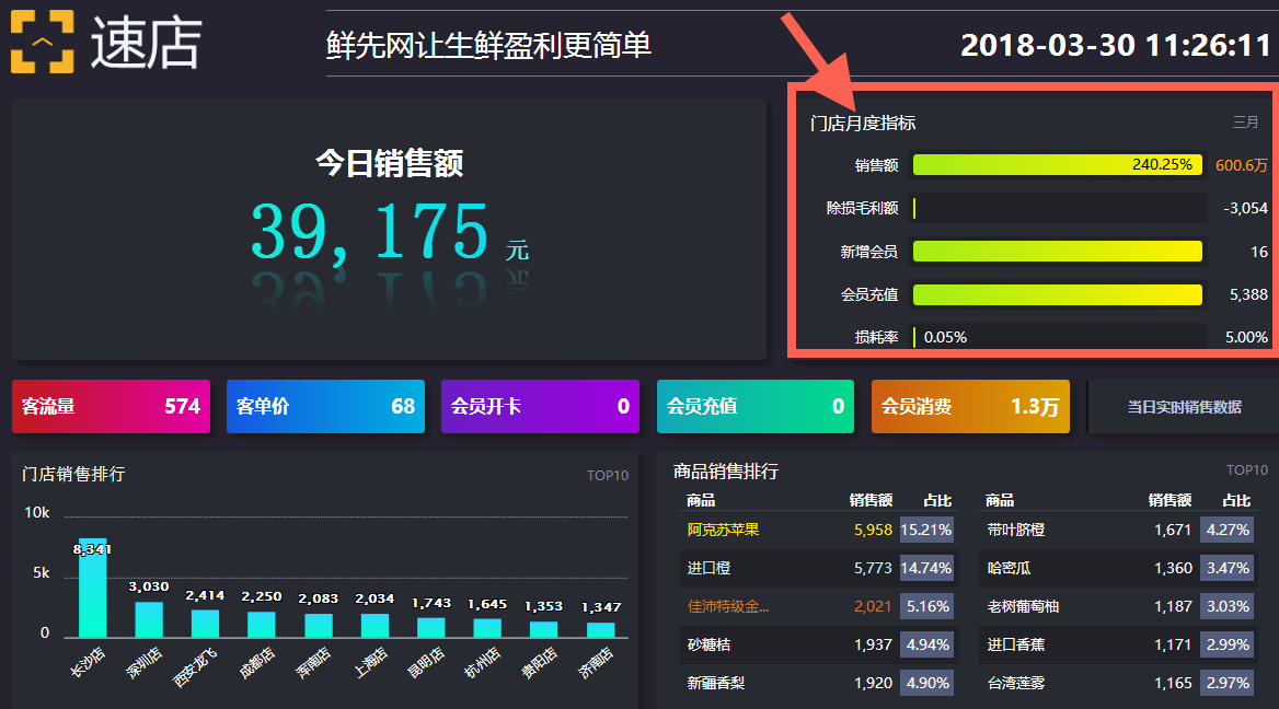 门店月度指标也是实时更新的,但是以月为表现周期。主要功能是实现老板实时跟踪门店经营情况。这部分主要由销售、除损毛利额、新增会员、会员充值、损耗率五部分组成。当某一指标黄条满条就意味着当月该指标已经达标完成。另外,如果指标已经超过月度的目标还会显示百分比。如果黄条进度不如人意,决策者随时可以采取相关行动。