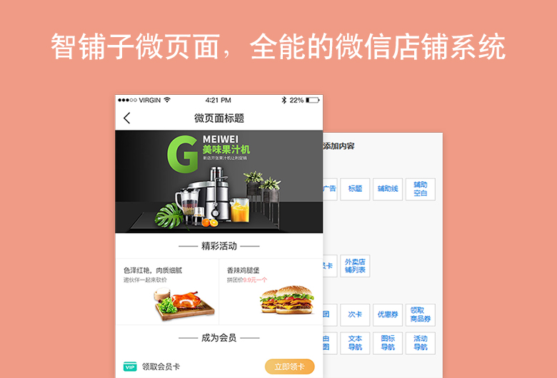 智铺子微页面20多个功能组件,页面内容、功能使用等,商家都可以自由选择,操作简单、易上手,是所有类型商家,不可错过的全能微页面,是微信店铺必不可少的应用工具。