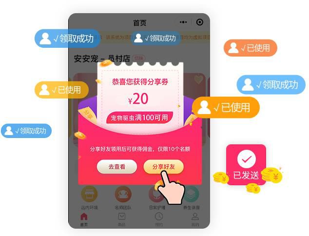 A的宠物店,想搞一场赠券促销,如何做才能达到客源业绩双增长?A可以向身边的亲朋好友或者老客户B发送“满100减20”的驱虫券每人10张,B除了自己使用一张之外,其余9张可以转发给朋友,朋友的狗刚好要做驱虫就可以直接使用,而B也能收到一定的推荐奖励,也乐于转发。(会员分销系统)