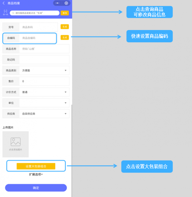 1.在建档的功能中,增加了高频字段的自编码和设置大包装组合。输入商品条码后,点击查找,如果是已经存在的商品则可以修改商品档案,否则提示新增商品,商品档案界面中可以增加自编码。