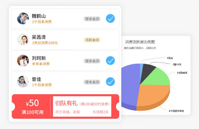 老客户唤醒:这个主要是针对长时间没有进店消费的会员做的营销,主要是通过会员管理系统的大数据统计把有段时间没有来店消费的会员统计出来,然后通过发送短信或者是优惠券的方式吸引客户,让客户愿意进店消费。通过这个方式不仅可以起到活动的推广和刺激,还可以引导客户来店消费。