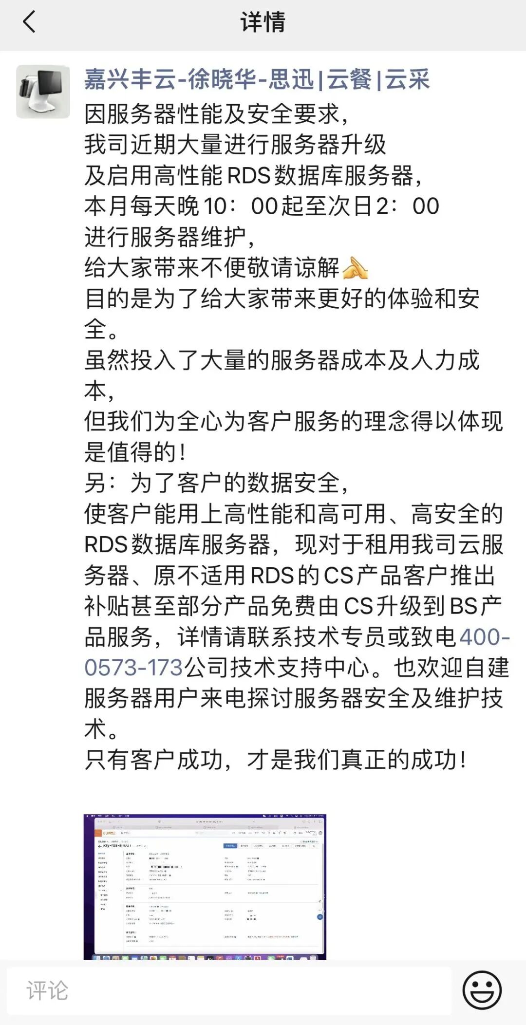 经过大半年的迭代优化,目前思迅B/S数据安全方案已趋于成熟,获得了不少合作伙伴的认可。前不久,思迅核心合作伙伴——嘉兴丰云网络科技有限公司徐晓华就发了朋友圈,宣布将大规模启用RDS数据库服务器升级。