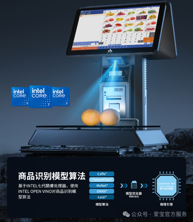 英特尔酷睿系列处理器跟openvino组件是爱宝AB-8688AI智能识物收银秤能够实现果蔬等商品识别率高达99.95%,识别速度高达200毫秒的底层支撑。