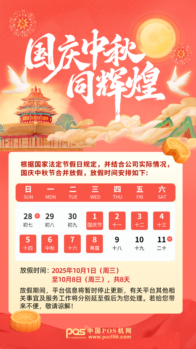 根据国务院关于国家法定节假日的规定,并结合公司的实际情况,中国pos机网2025年中秋国庆节放假具体安排如下: