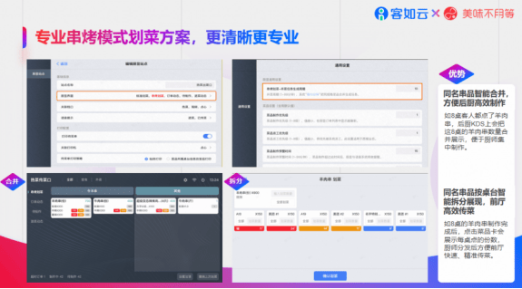 客如云后厨KDS智能厨显方案规划出餐模式,简单易用全面提效。智能合并或按桌拆分不同桌的同名菜品,便于后厨制作与前厅传菜。同时,按先到先出原则智能排菜;菜品合并显示避免混乱,批量划菜,满足“一锅多出”模式。此外,系统通过不同颜色色块对即将超时的菜品进行预警,一旦到达超时节点,还会自动触发语音提醒,多方位保障出餐效率与秩序。