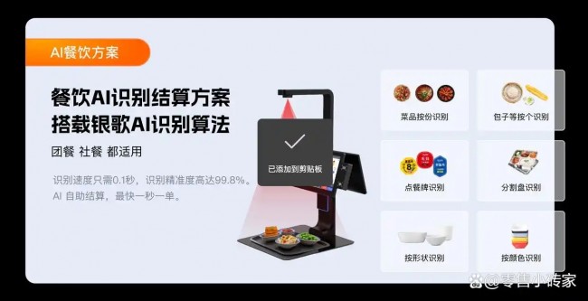银歌AI视觉识别结算台的核心竞争力在于其多模态识别架构。系统搭载的高清摄像头,配合自主研发的算法模型,对菜品/餐盘形状、菜品纹理、色彩分布等多特征维度进行实时分析。测试数据显示,识别精准度99.8%以上,识别耗时仅0.01秒。开发了动态补偿算法,有效克服蒸汽遮挡、光线阴影等环境干扰;还建立了持续进化的数据闭环,每家门店的运营数据都会反哺模型优化。