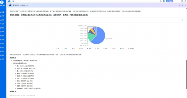简单一句话,系统即刻生成可视化图表。食品、日用品、家电等各类别的销售贡献一目了然。