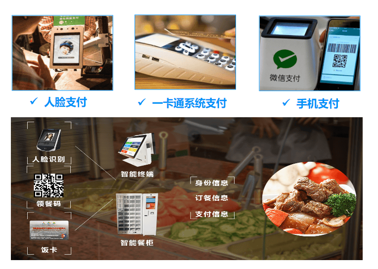 自动识别所有菜品、精准计算餐费、生成消费明细、支持刷脸、校园卡、扫码等多种支付方式,实现全程自助结算。