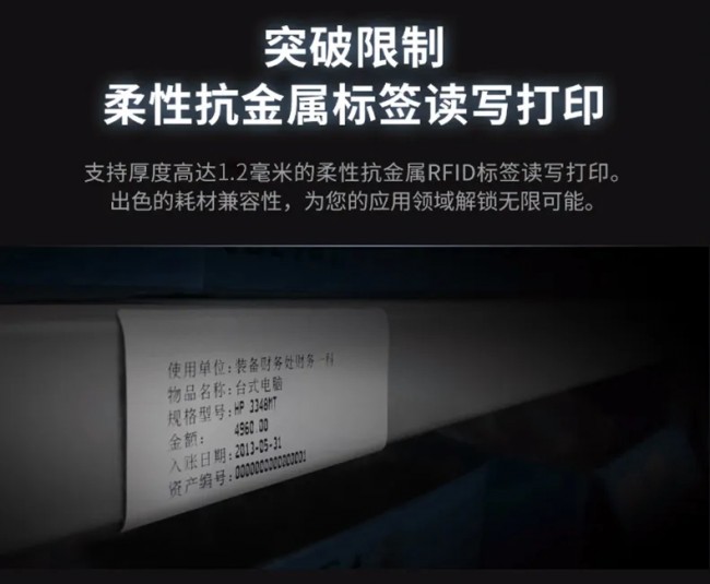 柔抗金属标签兼容升级:突破材质限制,可读写打印厚度达 1.2 毫米的柔性抗金属 RFID 标签,完美适配资产盘点(如设备标识)等复杂场景;