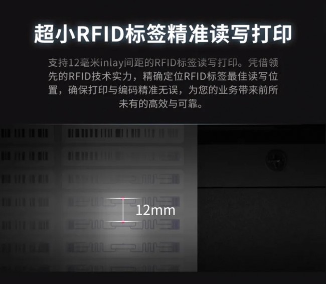 超小 RFID 标签精准读写,支持 12 毫米 inlay 间距的超小 RFID 标签打印,通过精确定位技术,确保打印与编码零误差,适配高密度标签场景