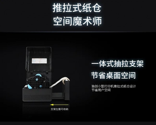专为桌面场景设计的推拉式纸仓 + 一体式抽拉支架,堪称 “桌面空间魔术师”,支架可左推收纳,大幅节省桌面占用面积;纸仓开合便捷,耗材更换更高效,兼顾小型机身与实用容量。