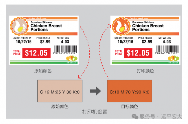 与传统单色标签相比,远平条码6530支持彩色打印,可以在一张标签上同时呈现: