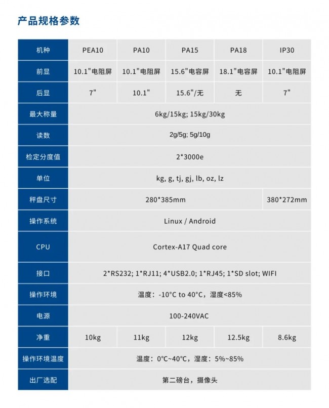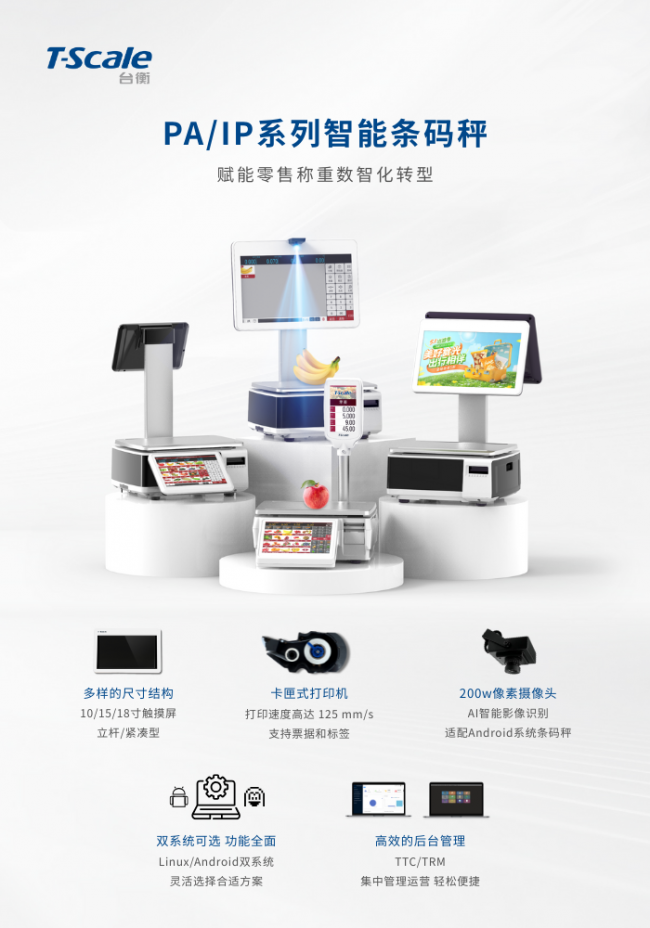 称重太慢,管理太乱?台衡PA&IP系列,重新定义高效零售的智能条码秤。大尺寸触摸屏,搭配灵活的外观结构,自由选择立杆与屏幕。接口丰富,可外接多种周边设备,满足更多功能需求。双系统可选,只为提供更全面高效的方案。持续致力于提升门店数字化的速度与高度,力求精准覆盖各样场景,为零售行业带来更高效、更智能的称重体验,让每一家门店都“更聪明”地运作。10.1寸一体式电阻触摸屏,15.6/18.1寸电容触摸屏,分别搭配7/10.1/15.6寸客显。采用卡匣式打印机,容量大、换纸便捷,轻松应对客流高峰。坚固的机身,按需选择的立杆与贴合零售流程的显示角度,满足不同区域的陈列与操作需求,适配从前台收银、自助秤到加工区等多种门店环境。200w像素摄像头,支持单显与双显结构,结合安卓系统的影像识别功能,快速精确识别各类商品。自动匹配 PLU,大幅减少人工选择步骤,降低误操作率,让称重流程更加顺畅。自动学习,主动纠错,记录识别历史,有效提升整体运营效率。3. Linux/Android系统及强大的称重应用全系列产品支持 Linux 与 Android 双系统选择,满足不同的业务结构与软件生态需求:Linux 系统:安全稳定、运行高效,贴合定制化系统需求。Android 系统:功能扩展性强,可兼容自有软件、第三方应用与云端平台。两种系统分别运行台衡自研的不同零售称重应用,包括自助、预包装、计数等多种模式,功能全面,旨在满足零售过程全需求。T-Touch Central管理软件与T-scale Retail Management在线平台,实现商品信息、库存数据、设备状态、价格调整等内容的统一管理。多设备同步更新、远程维护、标签模板统一推送,让门店无需逐台设置,大幅减少管理成本。并支持销售数据回传、库存同步,为企业提供更精准的运营决策依据。