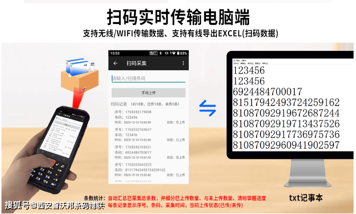 码采集解决方案,支持多方式录入数据实时上传、统计条数、显示状态等,支持离线传输,数据查询导出EXCEL,支持二次开发,无线/wifi实时传输数据,适用于高频率扫码、准确管理状态、快速导出数据的场景。