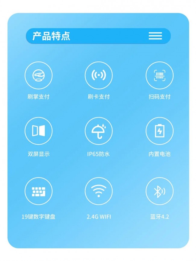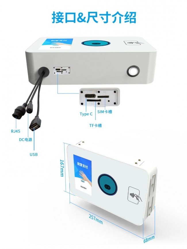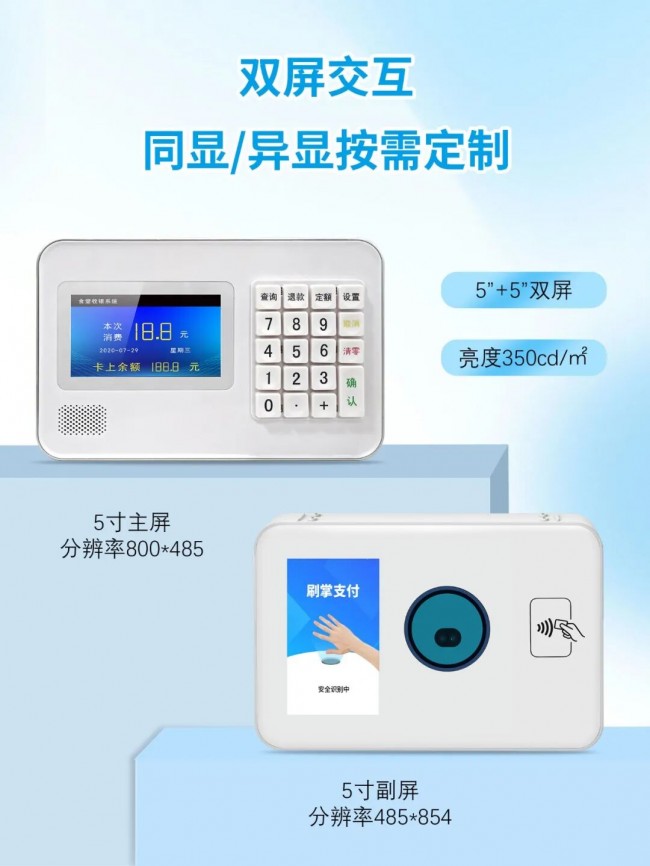 核心合作价值:三大维度破解项目落地难题1. 全支付覆盖+高效结算,满足多元客户需求 嵌入式O4模组集成掌纹静脉双因子识别、NFC读卡、手机二维码识别三大支付方式,完美适配高校(学生一卡通、手机支付)、政企(公务卡、掌纹支付)不同场景需求,无需额外搭配设备,降低项目集成成本。毫秒级识别响应,高峰时段人均结算≤2秒,解决食堂排队核心痛点,提升客户满意度,成为项目投标加分项。2. 硬核配置+稳定耐用,适配复杂场景长期使用5+5英寸双屏交互设计,顾客屏与服务屏双向同步订单信息,减少沟通误差;19键数字键盘适配人工录入场景,操作更便捷。IP65级防水防油防尘机身,轻松抵御食堂油污、水渍、粉尘侵蚀,经万次耐磨测试,长期高频使用仍稳定运行,降低后期运维成本。内置可充电电池+蓝牙/WiFi双模连接,断电、网络波动场景下仍能正常工作,提升项目交付可靠性。3. 灵活定制+无缝对接,降低集成落地门槛作为定制化生产服务商,博时特支持硬件接口、软件系统灵活适配,可无缝对接合作伙伴的智慧食堂管理平台,实现数据实时同步(消费数据、设备状态)。从外观颜色到功能模块,可根据项目需求个性化调整,满足高校、政企不同场景的定制化诉求,助力合作伙伴快速响应客户需求,缩短项目交付周期。