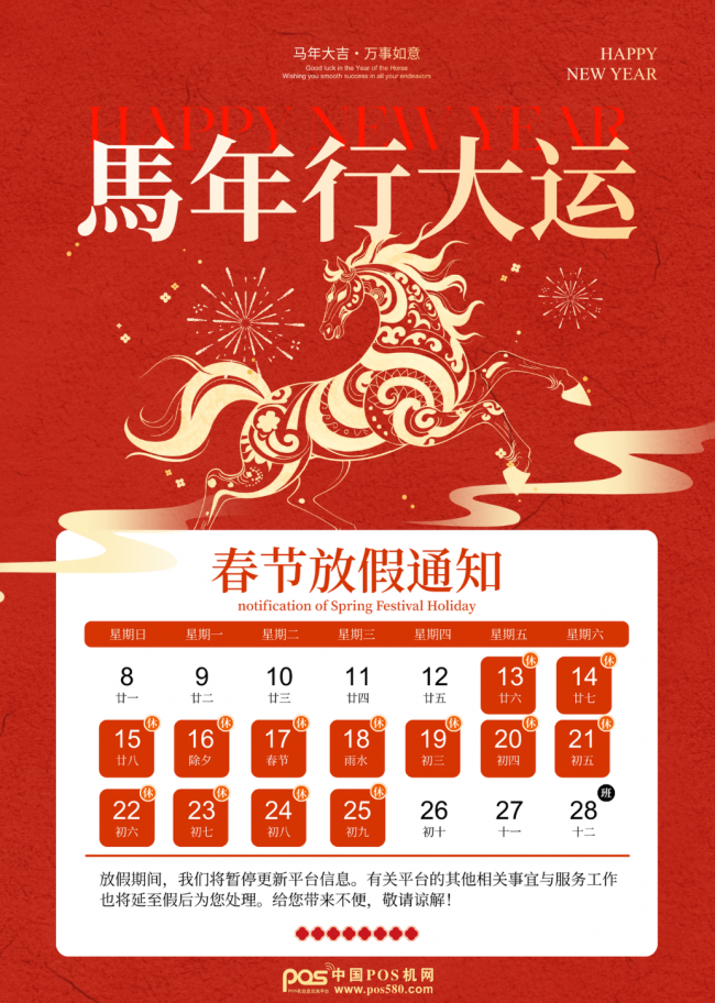 龙马精神承福运,骏马奔腾启新程。春节即将来临,中国pos机网全体同仁给大家拜年了,祝大家在新的一年里工作顺利、身体健康、阖家幸福、万事如意!