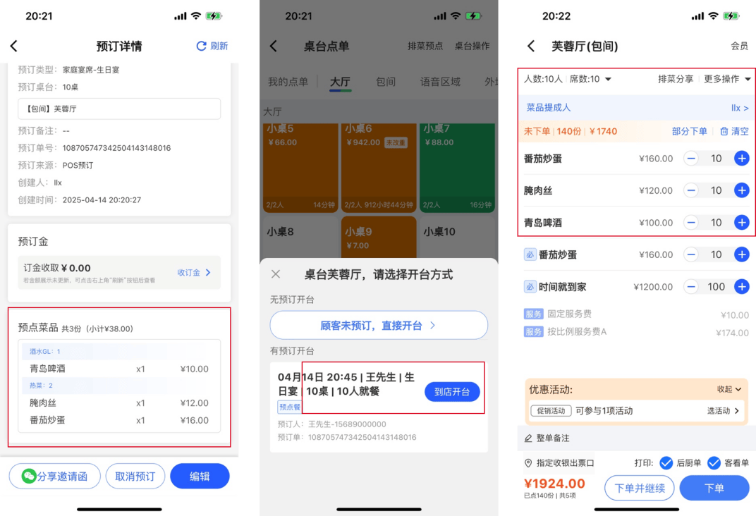 预订场景下的功能也同样实现便捷高效,支持电子邀请函、短信提醒提升到店率;可提前排菜、到店秒开台,并灵活加改菜品;包厢消费后自动生成带菜品评价的电子小票,助力出品优化。