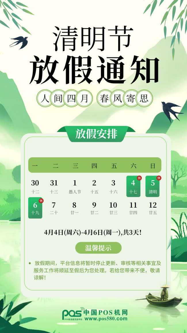 中国POS机网2024年清明节放假通知