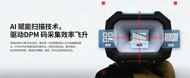 这款扫码枪搭载 1280×1024 像素图像传感器,搭配面光源与多光谱补光方案,可均匀覆盖不同材质与光线环境,降低反光干扰,提升成像效果。扫码枪识读精度≥3.33mil,运动容差达 4m/s,常规可识别对比度 10%,可顺畅识别一维码与二维码,适配点刻、蚀刻等多种载体码制,满足多样化采集需求。依托本地 NPU 算力的 AI 技术,扫码枪融合新一代四核解码关键与升级版解码算法,针对 DPM 码采集流程深度优化,轻松识读点刻、激光蚀刻、化学蚀刻的条码,妥善应对模糊、破损、低对比度等复杂状况,让难读码场景的采集效率大幅提升。