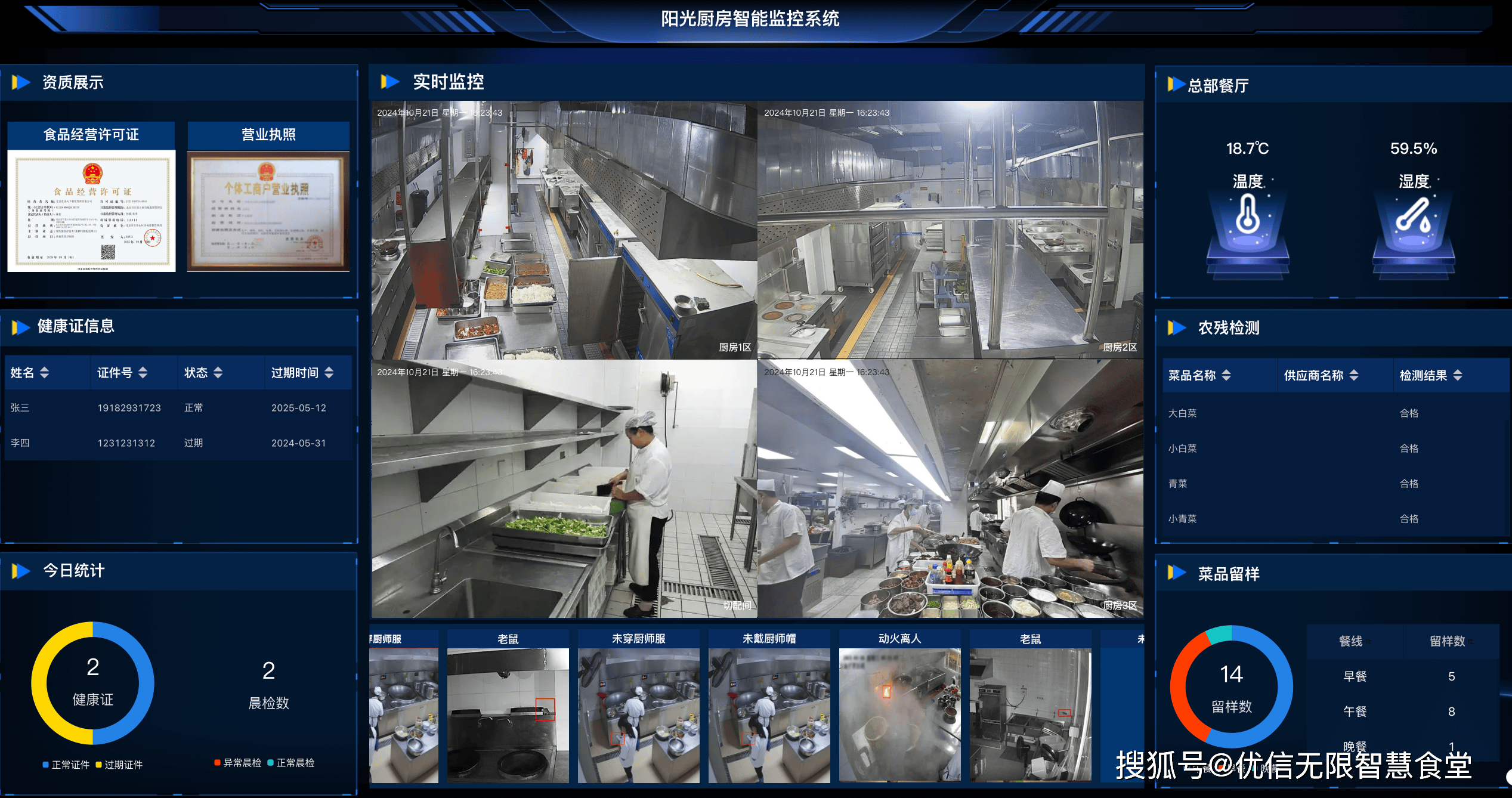 ②AI明厨亮灶监控系统:在后厨关键区域部署高清摄像头,利用AI算法对未戴口罩、吸烟、玩手机及鼠患等违规行为进行24小时智能抓拍与预警。这不仅满足了食安监管的合规要求,更让后厨管理透明化,提升就餐者的信任感。