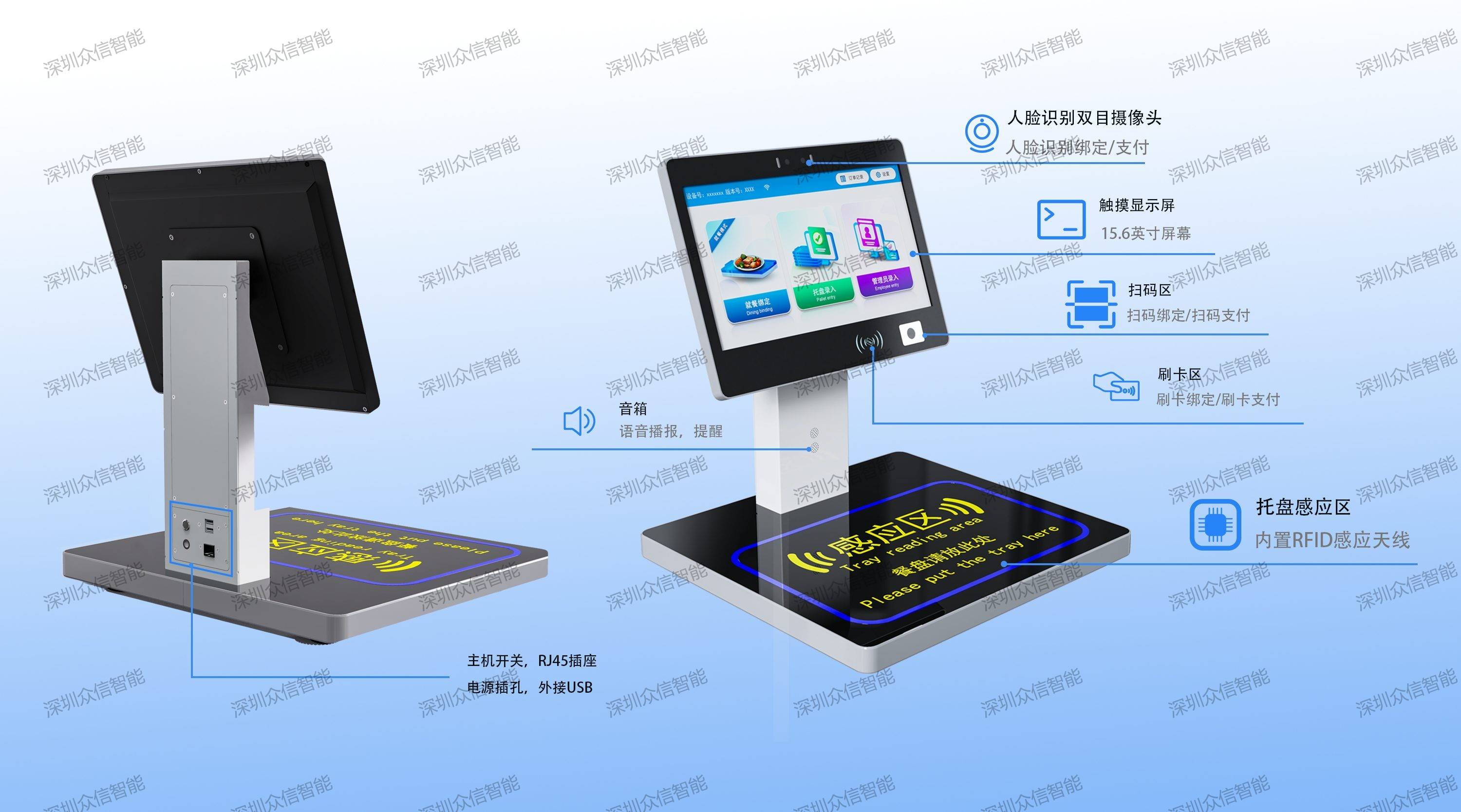 众信智能智能称重结算台集显示终端、托盘感应区、高精度智能秤、自助餐炉于一体,结构紧凑、布局合理,可直接嵌入餐线或台面摆放,安装灵活、部署简便。设备内嵌高精度重力传感器,称重精度精确到克,能够实时捕捉菜品重量变化,自动计算消费金额,实现 “一菜一价、按量计费、无感结算”,彻底改变传统自助餐 “吃多吃少都一样” 的不合理模式。