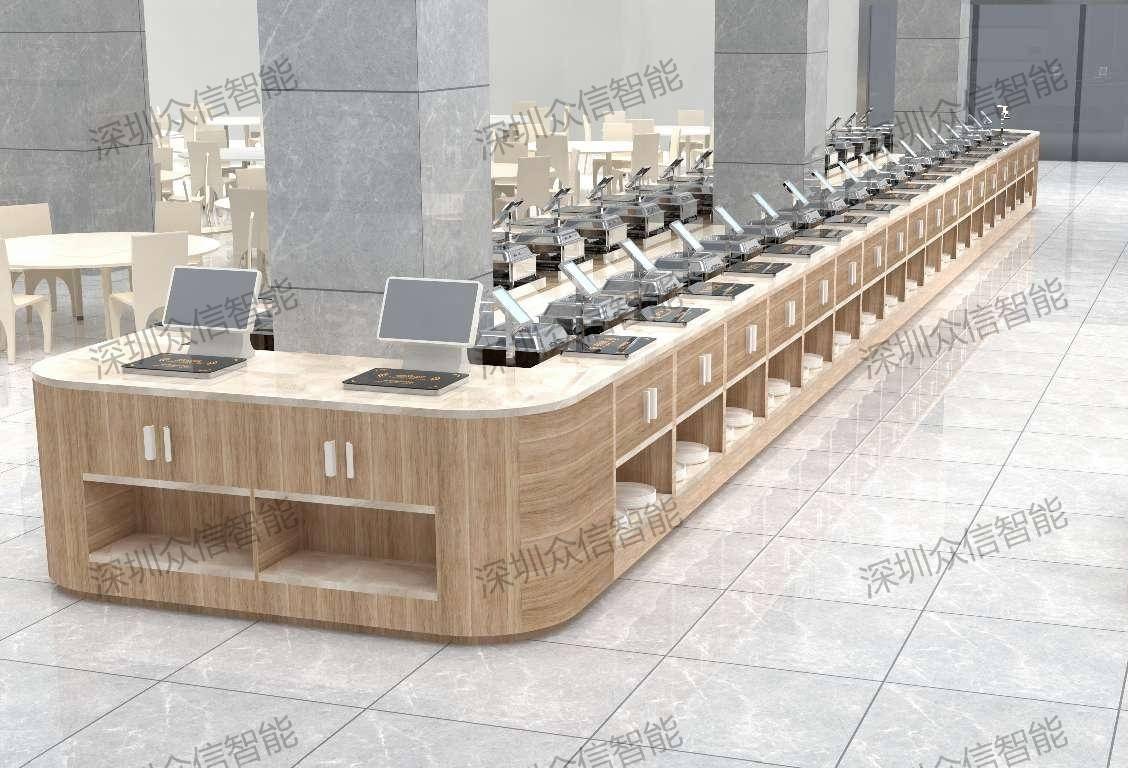 众信智能称重计量自助餐解决方案形成完整的智能化就餐闭环,核心设备包括智能称重结算台、智能绑盘一体机、智能取盘机、人脸计次消费闸机,覆盖取盘、绑定、选餐、结算、扣费全环节。