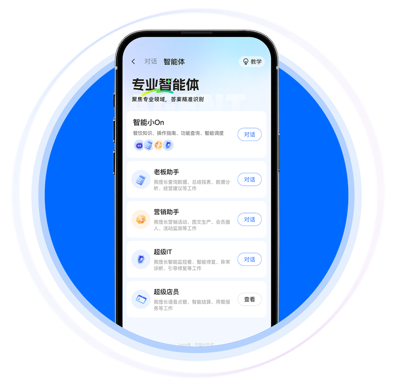 客如云五大AI智能体聚焦餐饮经营各专业领域,为门店运营精准赋能。其中,“智能小On”支持语音交互与多任务调度,语音即可查询经营数据、调取菜品趋势,还能解答系统操作问题,助力决策从经验转向数据;“老板助手”专研数据处理,自动生成经营日报、分析菜品销售情况,为菜品调整提供直接依据;“超级店员”实现AI语音点餐,覆盖开台、点单等前厅场景,还联动KDS智能后厨实现菜品超时预警,把控出餐节奏;“营销助手”可智能生成营销方案,“超级 IT”能实时预警并自动修复系统异常,从经营决策到门店运维,实现多环节智能提效。