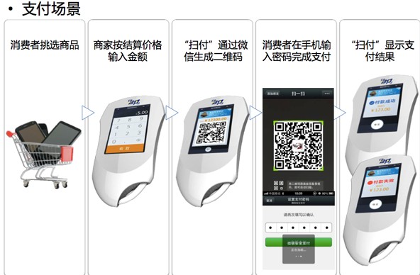 比如在饭店,用户消费后,直接在你微信POS机上完成支付,信息会传到你信息系统。同时你有一个公众账号,开发了在线点餐,用户点完餐,完成支付,生成一个二维码,送餐员送到餐用微POS扫描,确认你已经付款,同时把这一单交易统计到后台。这样就是一个线上线下完整的支付管理。
